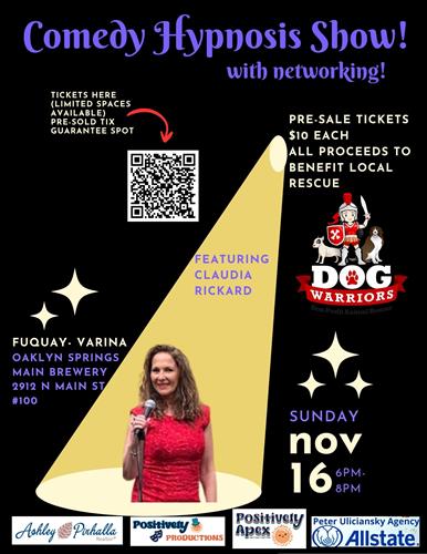 Our partner hosts are Ashley Pirhalla Realtor and Peter Uliciansky Allstate. We are also featuring our talented member, Claudia Rickard, Certified Hypnotist. She has added Comedy Stage Hypnosis to her many skills!